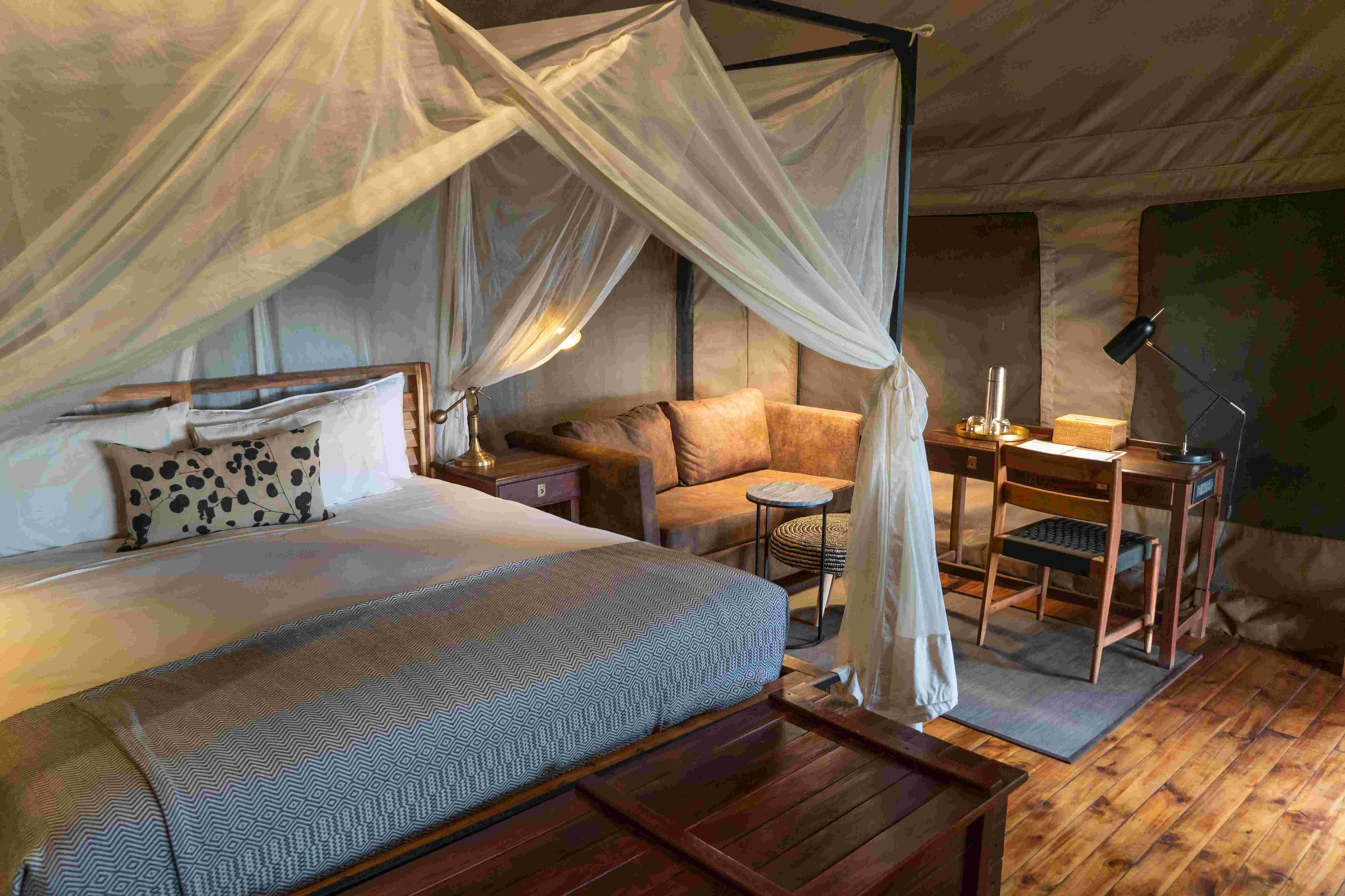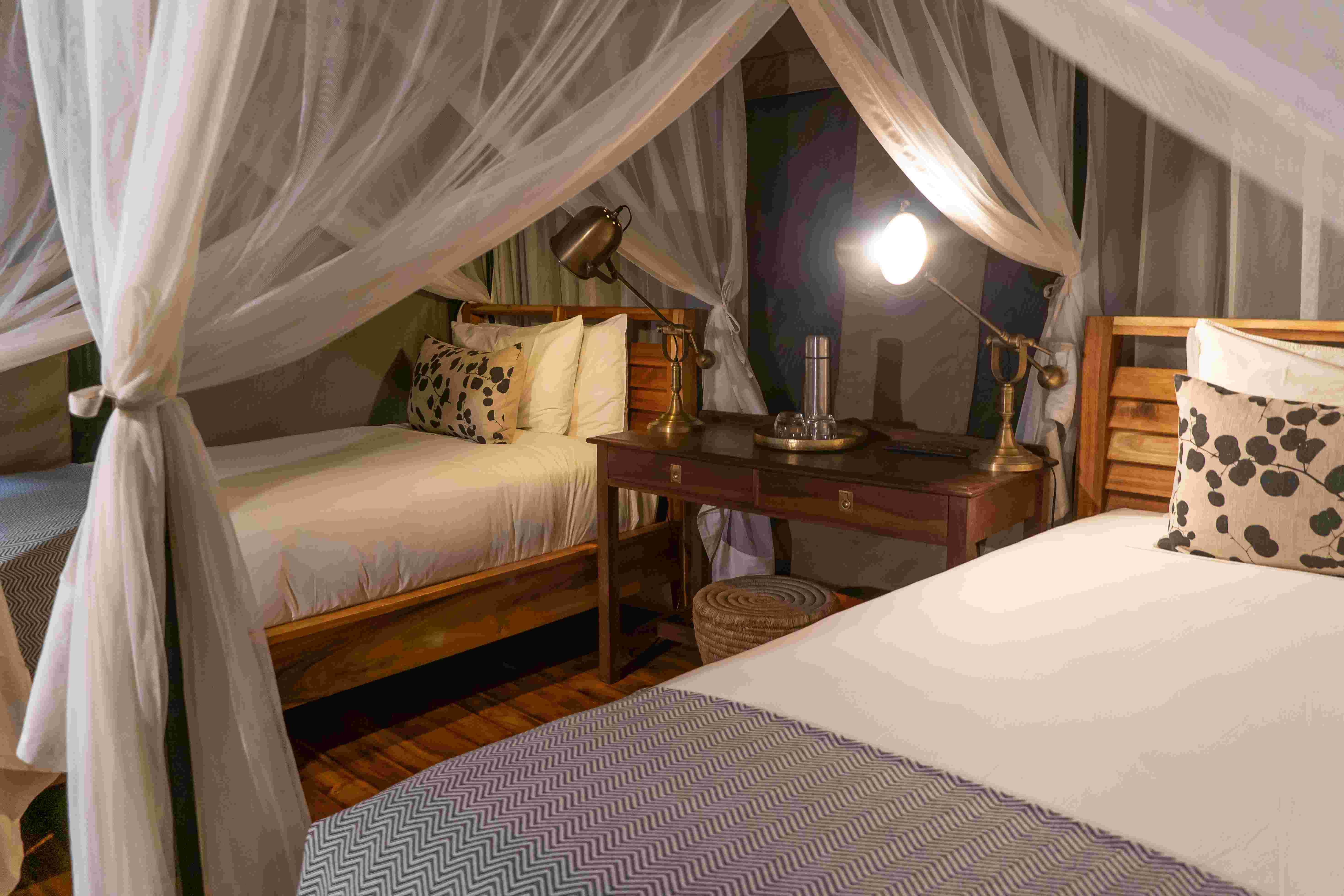 Comprised of just three luxury tented suites and one luxury family tented suite, Linyanti Ebony offers a more private family safari experience. Each luxury tented suite features a lavish king-size bed, an indoor and outdoor shower, and an elegant writing desk – perfect for capturing your memories in the African wild. The spacious two-bedroom family unit features a self-contained lounge, a private viewing deck overlooking the wetlands, and freestanding bath. Larger family groups or parties of friends travelling together can reserve Linyanti Ebony exclusively (with a minimum of eight people).